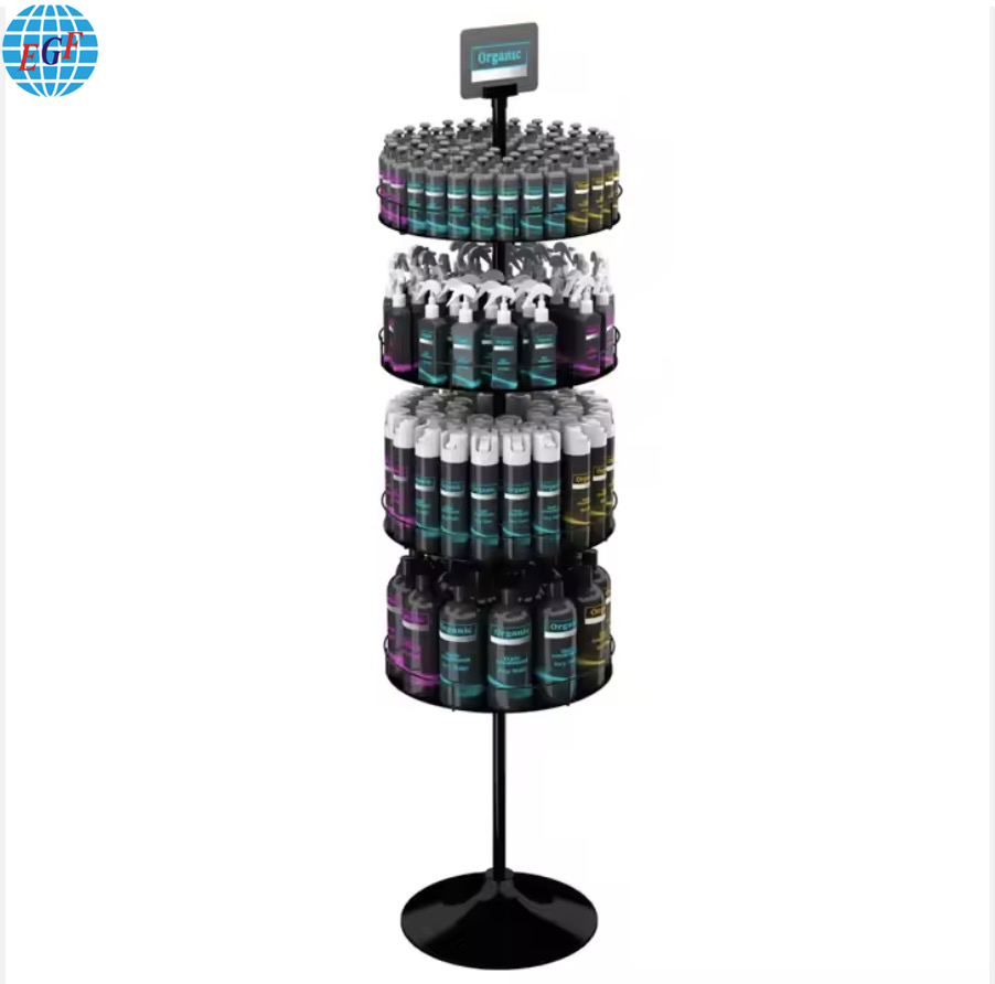Retail Store High-Quality Four-Tier Metal Rotating Display Stand for Toys, Snacks, Drinking Bottles, Shower Gel, Spray Cans, with Circular Base, Black, Customizable